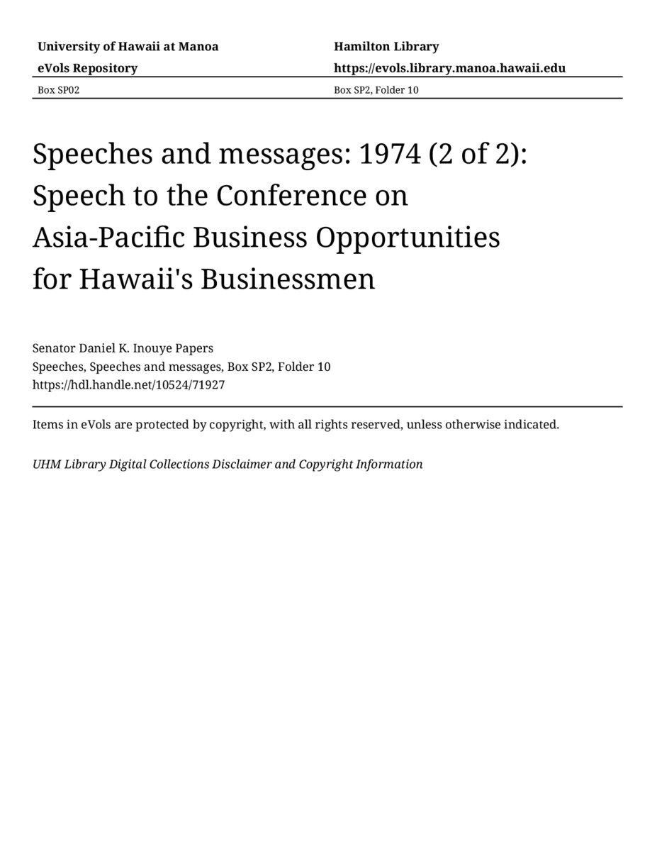- Speech to the Conference on Asia-Pacific Business Opportunities for Hawaii's Businessmen