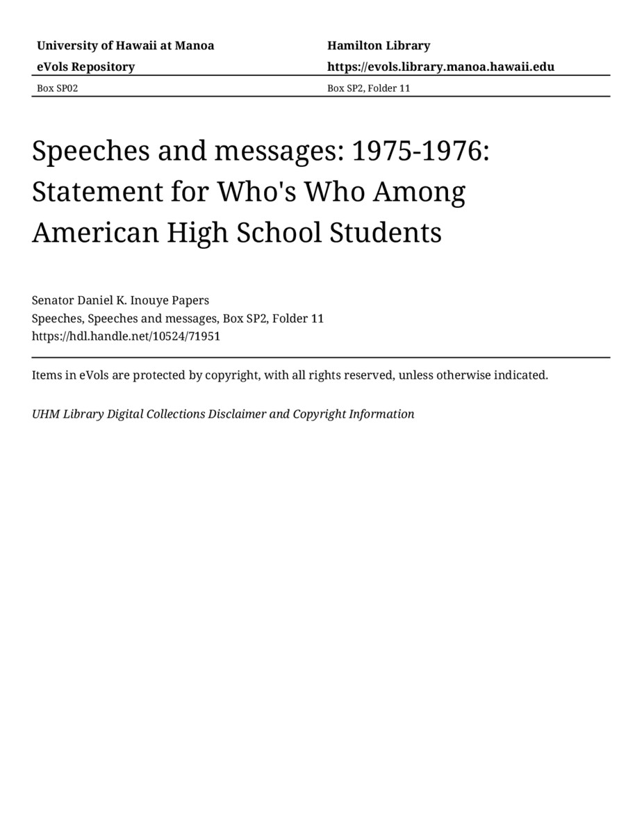 Statement for Who's Who Among American High School Students, June 2, 1976, MANUSCRIPT-HCPC00011, Speeches, Speeches and messages, Box SP2, Folder 11, Senator Daniel K. Inouye Papers, Hawaiʻi Congressional Papers Collection, University of Hawaiʻi at Mānoa Library, Honolulu, HI. https://congressarchives.org/catalog/10524_71951 (accessed March 22, 2026).