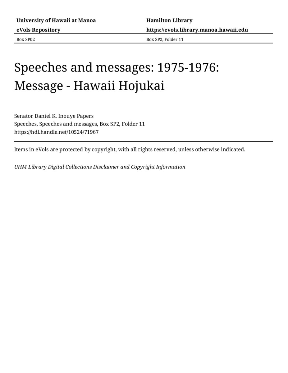 Message - Hawaii Hojukai, July 16, 1975, MANUSCRIPT-HCPC00011, Speeches, Speeches and messages, Box SP2, Folder 11, Senator Daniel K. Inouye Papers, Hawaiʻi Congressional Papers Collection, University of Hawaiʻi at Mānoa Library, Honolulu, HI. https://congressarchives.org/catalog/10524_71967 (accessed March 19, 2026).