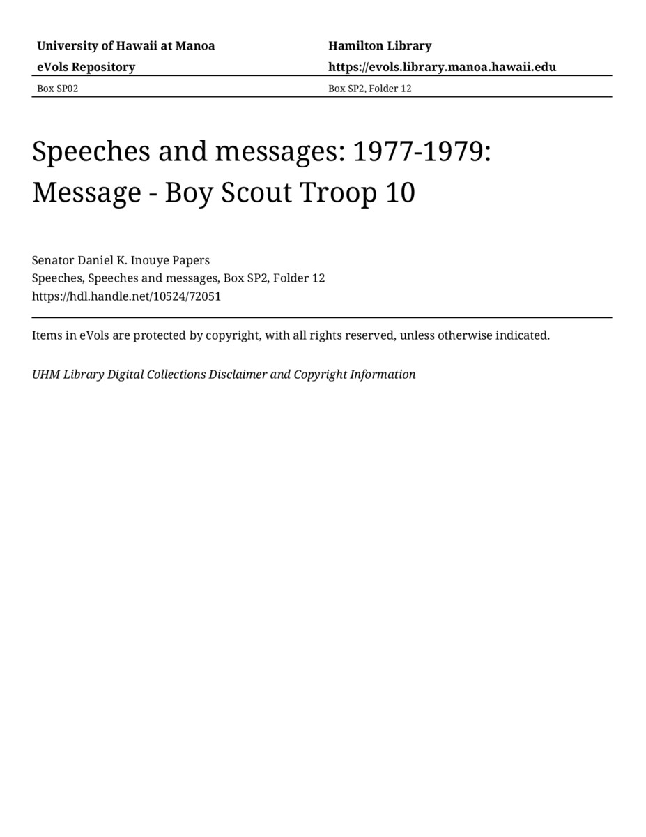 Message - Boy Scout Troop 10, May 6, 1977, MANUSCRIPT-HCPC00011, Speeches, Speeches and messages, Box SP2, Folder 12, Senator Daniel K. Inouye Papers, Hawaiʻi Congressional Papers Collection, University of Hawaiʻi at Mānoa Library, Honolulu, HI. https://congressarchives.org/catalog/10524_72051 (accessed March 20, 2026).