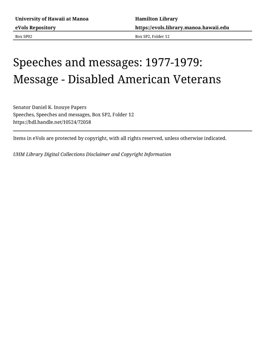 Message - Disabled American Veterans, June 1, 1977, MANUSCRIPT-HCPC00011, Speeches, Speeches and messages, Box SP2, Folder 12, Senator Daniel K. Inouye Papers, Hawaiʻi Congressional Papers Collection, University of Hawaiʻi at Mānoa Library, Honolulu, HI. https://congressarchives.org/catalog/10524_72058 (accessed March 20, 2026).
