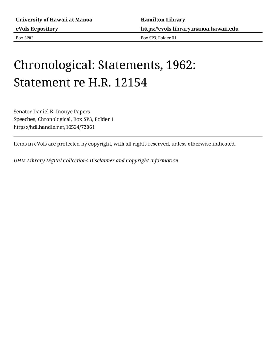Statement re H.R. 12154, June 18, 1962, MANUSCRIPT-HCPC00011, Speeches, Chronological, Box SP3, Folder 1, Senator Daniel K. Inouye Papers, Hawaiʻi Congressional Papers Collection, University of Hawaiʻi at Mānoa Library, Honolulu, HI. https://congressarchives.org/catalog/10524_72061 (accessed March 17, 2026).