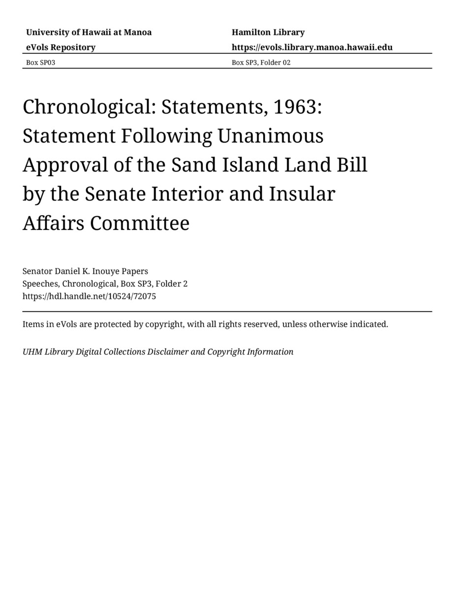 Statement Following Unanimous Approval of the Sand Island Land Bill by the Senate Interior and Insular Affairs Committee, 1963, MANUSCRIPT-HCPC00011, Speeches, Chronological, Box SP3, Folder 2, Senator Daniel K. Inouye Papers, Hawaiʻi Congressional Papers Collection, University of Hawaiʻi at Mānoa Library, Honolulu, HI. https://congressarchives.org/catalog/10524_72075 (accessed March 18, 2026).