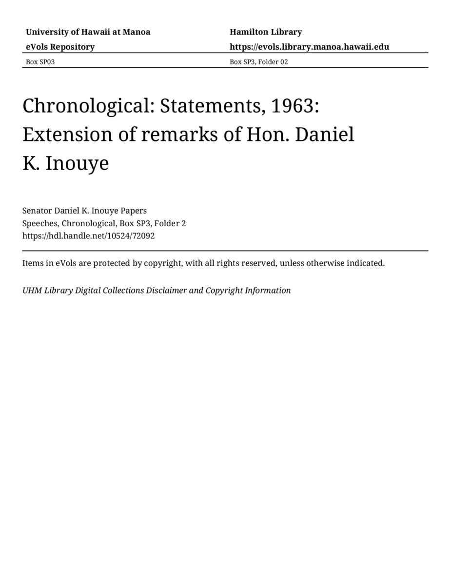 Extension of remarks of Hon. Daniel K. Inouye, 1963, MANUSCRIPT-HCPC00011, Speeches, Chronological, Box SP3, Folder 2, Senator Daniel K. Inouye Papers, Hawaiʻi Congressional Papers Collection, University of Hawaiʻi at Mānoa Library, Honolulu, HI. https://congressarchives.org/catalog/10524_72092 (accessed March 17, 2026).