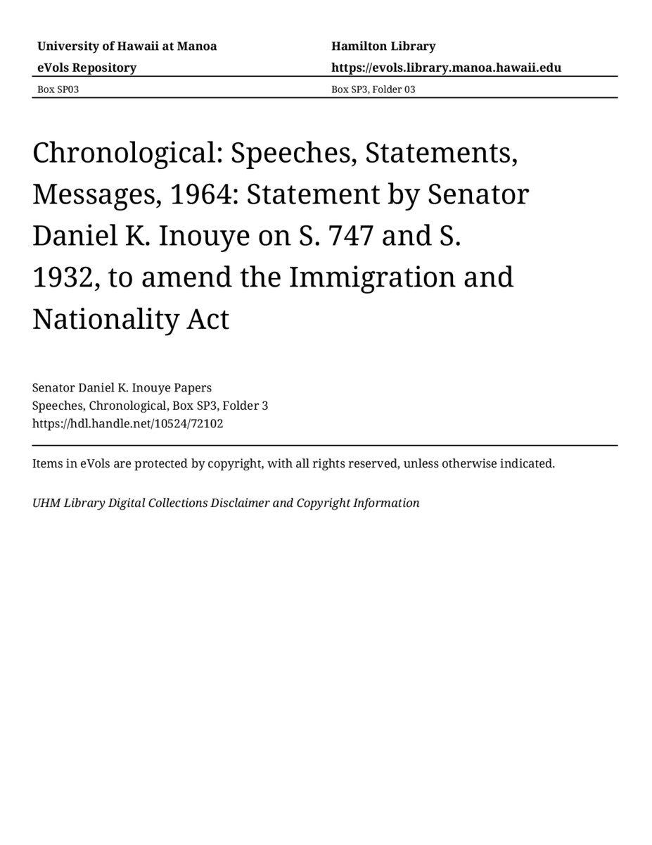 - Statement by Senator Daniel K. Inouye on S. 747 and S. 1932, to amend the Immigration and Nationality Act