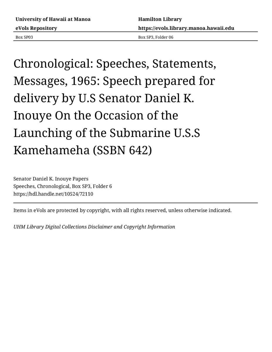 - Speech prepared for delivery by U.S Senator Daniel K. Inouye On the Occasion of the Launching of the Submarine U.S.S Kamehameha (SSBN 642)