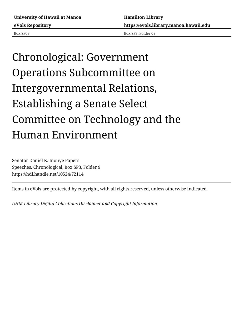 Government Operations Subcommittee on Intergovernmental Relations, Establishing a Senate Select Committee on Technology and the Human Environment, April 11, 1967, MANUSCRIPT-HCPC00011, Speeches, Chronological, Box SP3, Folder 9, Senator Daniel K. Inouye Papers, Hawaiʻi Congressional Papers Collection, University of Hawaiʻi at Mānoa Library, Honolulu, HI. https://congressarchives.org/catalog/10524_72114 (accessed March 20, 2026).
