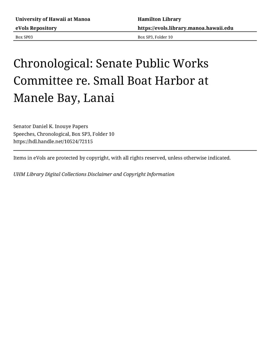 - Senate Public Works Committee re. Small Boat Harbor at Manele Bay, Lanai