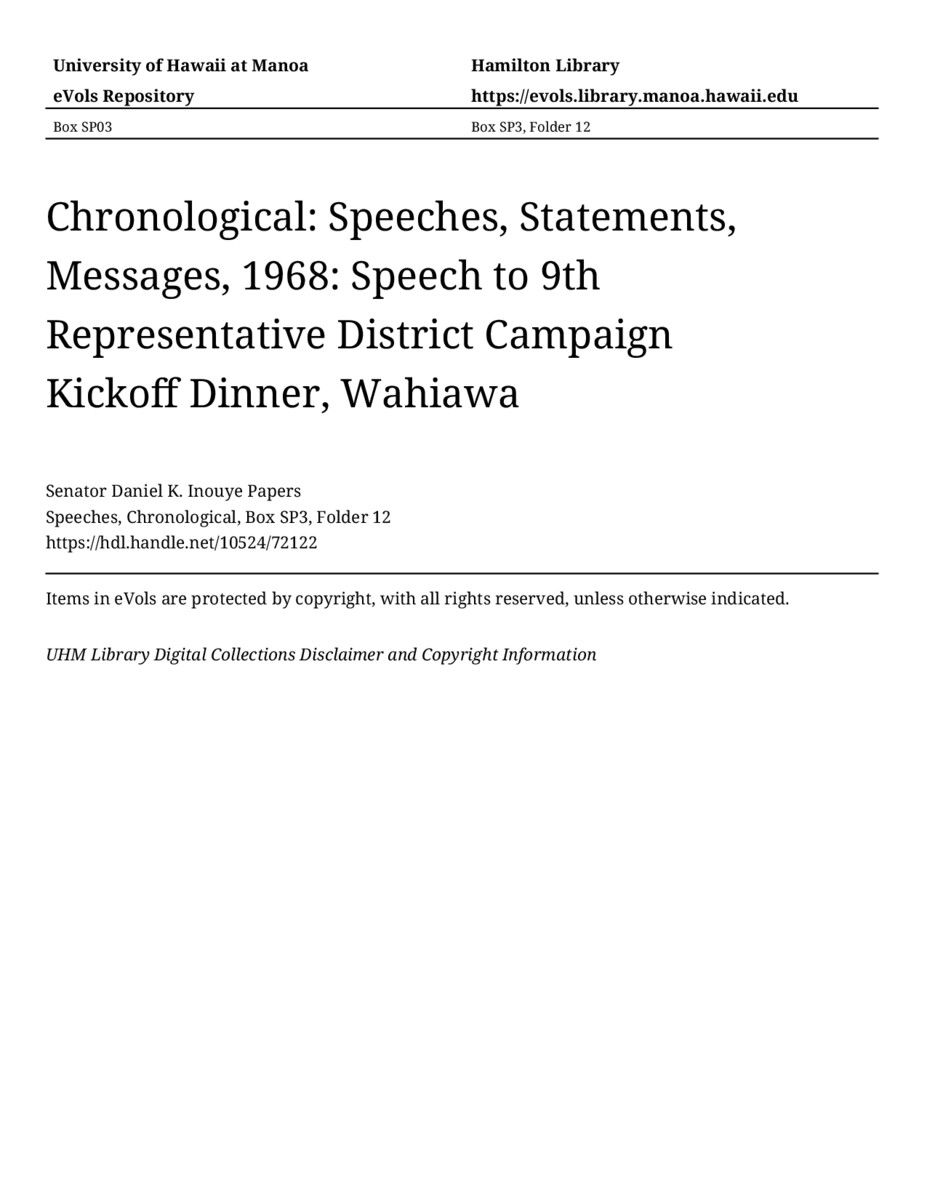 - Speech to 9th Representative District Campaign Kickoff Dinner, Wahiawa