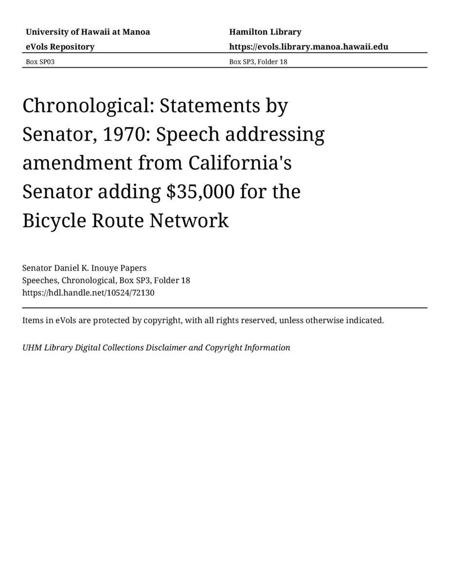 - Speech addressing amendment from California's Senator adding $35,000 for the Bicycle Route Network