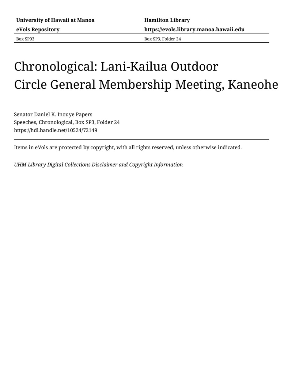 Lani-Kailua Outdoor Circle General Membership Meeting, Kaneohe, February 10, 1975, MANUSCRIPT-HCPC00011, Speeches, Chronological, Box SP3, Folder 24, Senator Daniel K. Inouye Papers, Hawaiʻi Congressional Papers Collection, University of Hawaiʻi at Mānoa Library, Honolulu, HI. https://congressarchives.org/catalog/10524_72149 (accessed March 20, 2026).