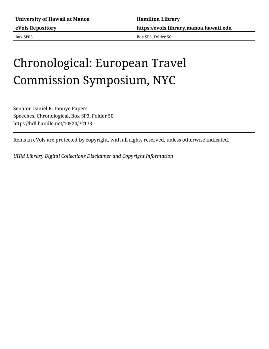European Travel Commission Symposium, NYC, September 24, 1975, MANUSCRIPT-HCPC00011, Speeches, Chronological, Box SP3, Folder 50, Senator Daniel K. Inouye Papers, Hawaiʻi Congressional Papers Collection, University of Hawaiʻi at Mānoa Library, Honolulu, HI. https://congressarchives.org/catalog/10524_72173 (accessed March 19, 2026).