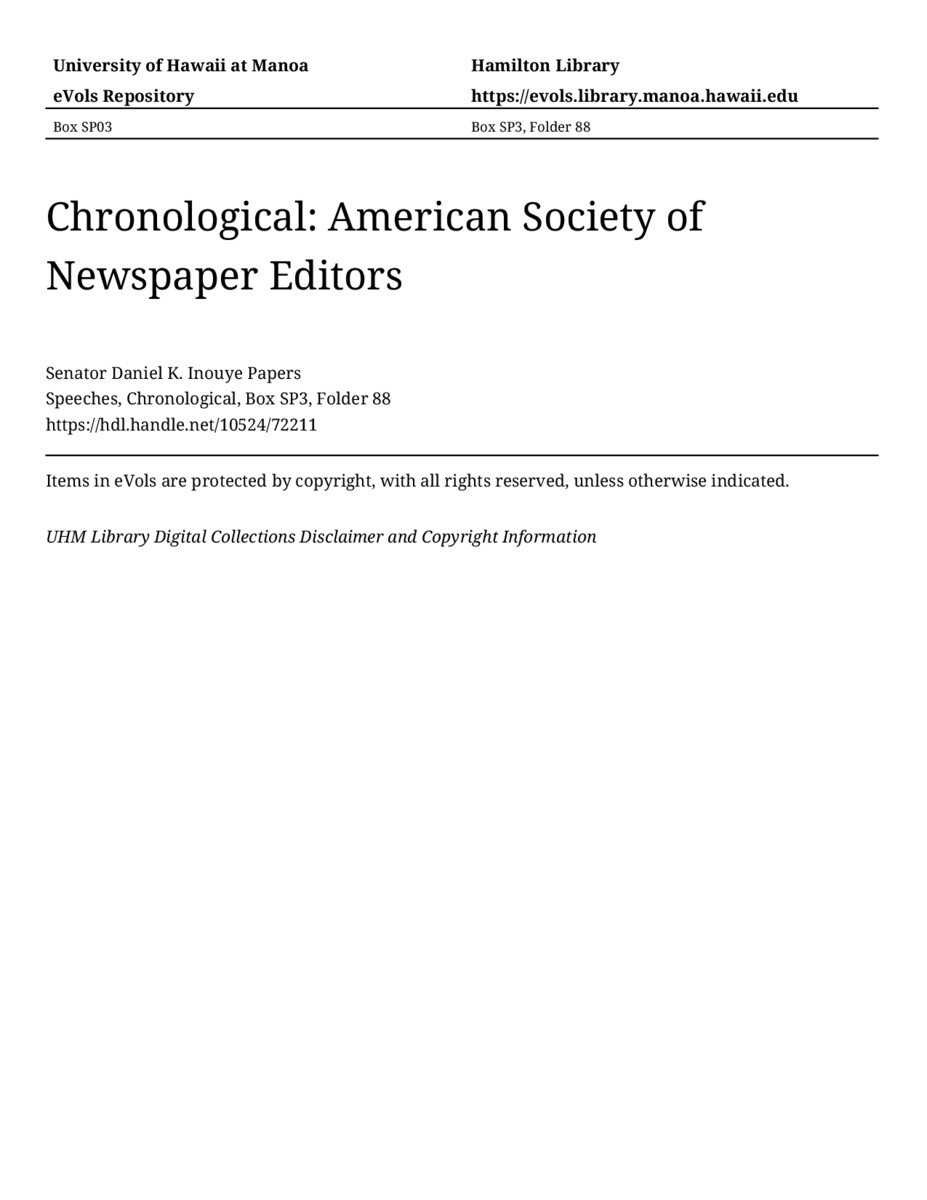 American Society of Newspaper Editors, May 2, 1977, MANUSCRIPT-HCPC00011, Speeches, Chronological, Box SP3, Folder 88, Senator Daniel K. Inouye Papers, Hawaiʻi Congressional Papers Collection, University of Hawaiʻi at Mānoa Library, Honolulu, HI. https://congressarchives.org/catalog/10524_72211 (accessed March 21, 2026).