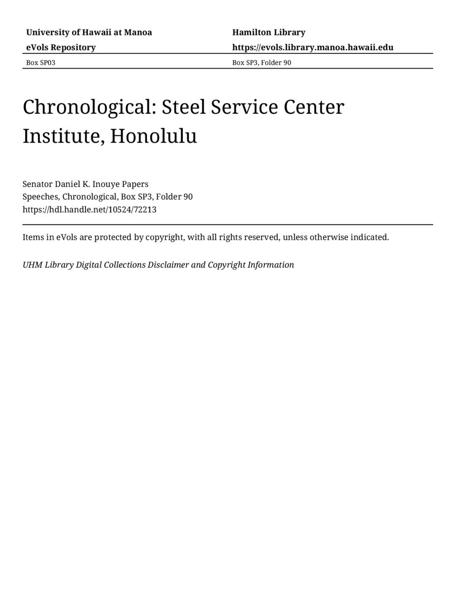 Steel Service Center Institute, Honolulu, May 9, 1977, MANUSCRIPT-HCPC00011, Speeches, Chronological, Box SP3, Folder 90, Senator Daniel K. Inouye Papers, Hawaiʻi Congressional Papers Collection, University of Hawaiʻi at Mānoa Library, Honolulu, HI. https://congressarchives.org/catalog/10524_72213 (accessed March 21, 2026).