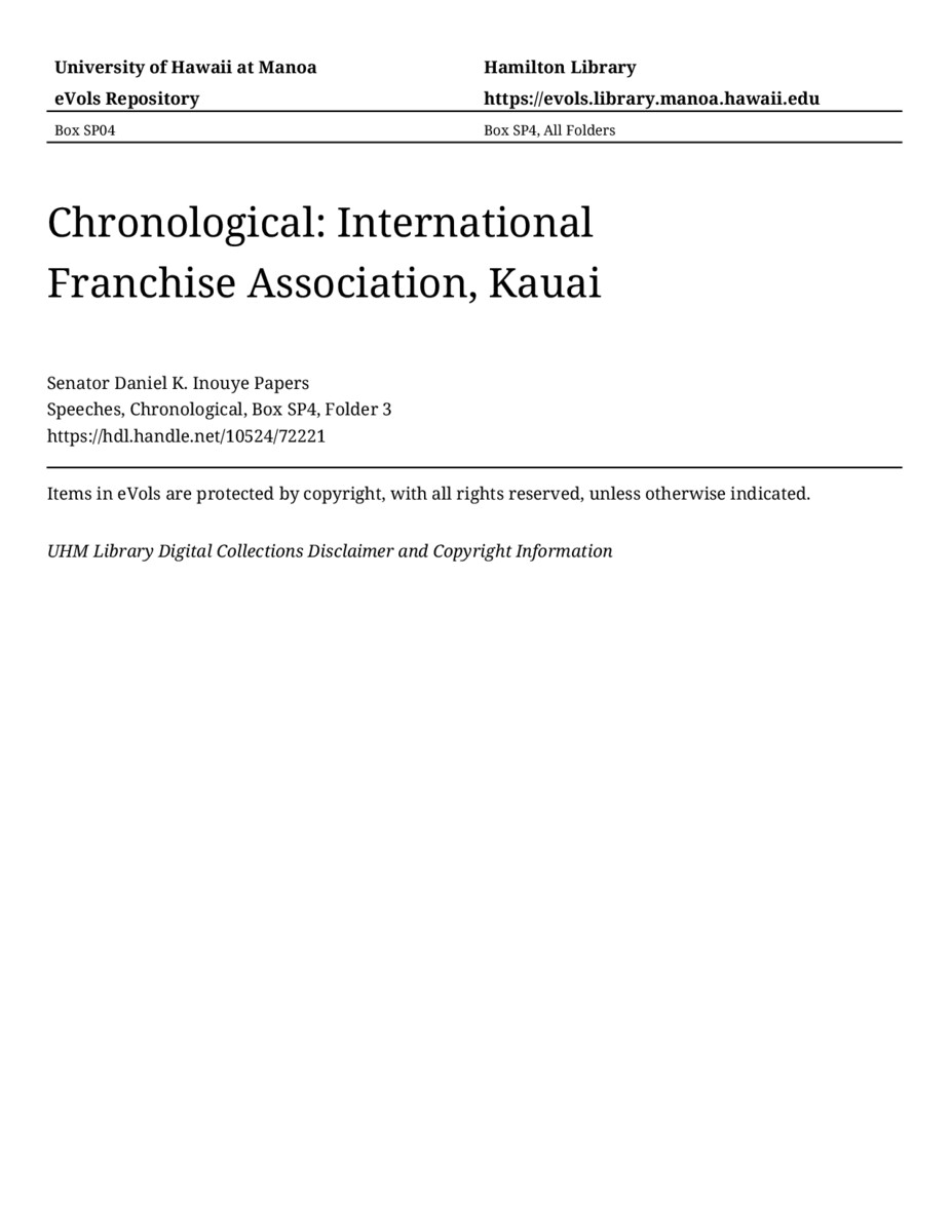 International Franchise Association, Kauai, February 2, 1978, MANUSCRIPT-HCPC00011, Speeches, Chronological, Box SP4, Folder 3, Senator Daniel K. Inouye Papers, Hawaiʻi Congressional Papers Collection, University of Hawaiʻi at Mānoa Library, Honolulu, HI. https://congressarchives.org/catalog/10524_72221 (accessed March 17, 2026).