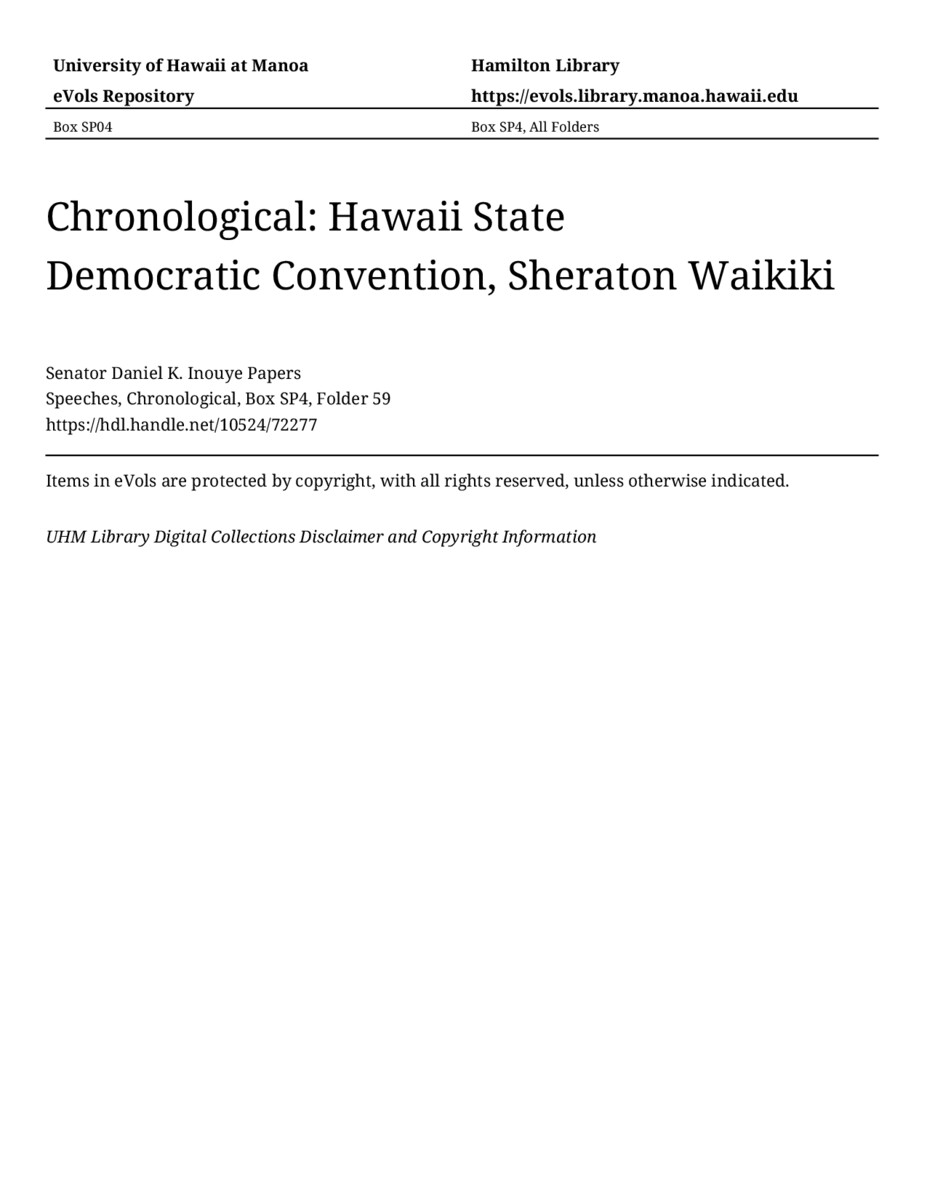 Hawaii State Democratic Convention, Sheraton Waikiki, May 31, 1980, MANUSCRIPT-HCPC00011, Speeches, Chronological, Box SP4, Folder 59, Senator Daniel K. Inouye Papers, Hawaiʻi Congressional Papers Collection, University of Hawaiʻi at Mānoa Library, Honolulu, HI. https://congressarchives.org/catalog/10524_72277 (accessed March 21, 2026).