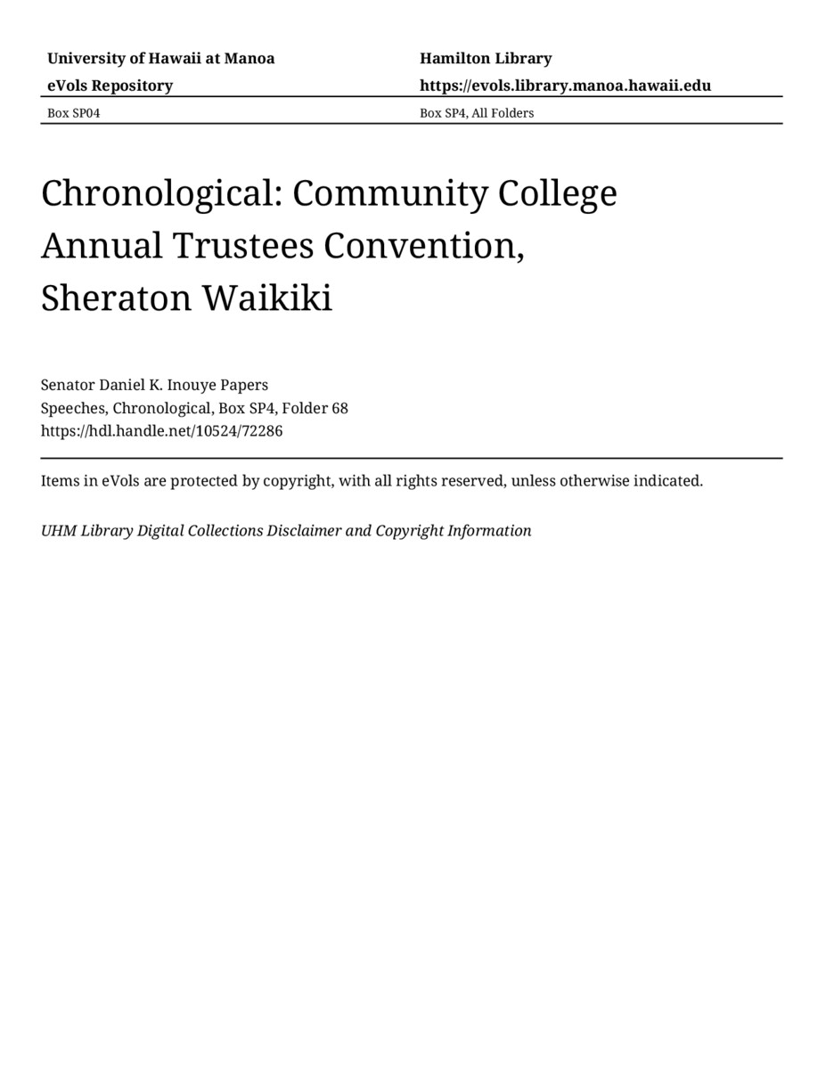 Community College Annual Trustees Convention, Sheraton Waikiki, October 6, 1980, MANUSCRIPT-HCPC00011, Speeches, Chronological, Box SP4, Folder 68, Senator Daniel K. Inouye Papers, Hawaiʻi Congressional Papers Collection, University of Hawaiʻi at Mānoa Library, Honolulu, HI. https://congressarchives.org/catalog/10524_72286 (accessed March 20, 2026).