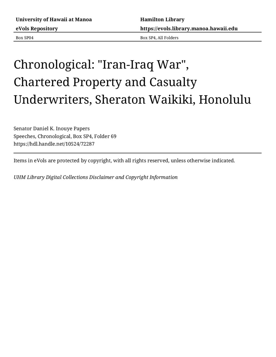 - "Iran-Iraq War", Chartered Property and Casualty Underwriters, Sheraton Waikiki, Honolulu