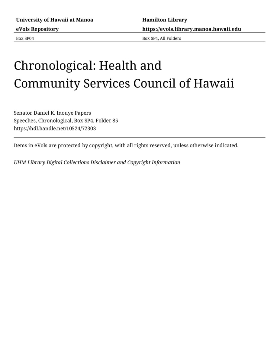 Health and Community Services Council of Hawaii, May 21, 1981, MANUSCRIPT-HCPC00011, Speeches, Chronological, Box SP4, Folder 85, Senator Daniel K. Inouye Papers, Hawaiʻi Congressional Papers Collection, University of Hawaiʻi at Mānoa Library, Honolulu, HI. https://congressarchives.org/catalog/10524_72303 (accessed March 21, 2026).