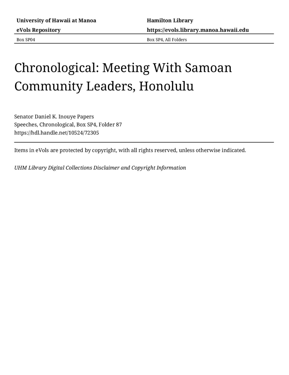 Meeting With Samoan Community Leaders, Honolulu, June 6, 1981, MANUSCRIPT-HCPC00011, Speeches, Chronological, Box SP4, Folder 87, Senator Daniel K. Inouye Papers, Hawaiʻi Congressional Papers Collection, University of Hawaiʻi at Mānoa Library, Honolulu, HI. https://congressarchives.org/catalog/10524_72305 (accessed March 21, 2026).