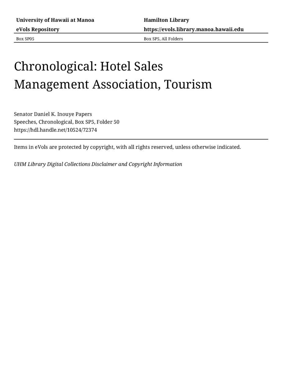 Hotel Sales Management Association, Tourism, June 17, 1983, MANUSCRIPT-HCPC00011, Speeches, Chronological, Box SP5, Folder 50, Senator Daniel K. Inouye Papers, Hawaiʻi Congressional Papers Collection, University of Hawaiʻi at Mānoa Library, Honolulu, HI. https://congressarchives.org/catalog/10524_72374 (accessed March 21, 2026).