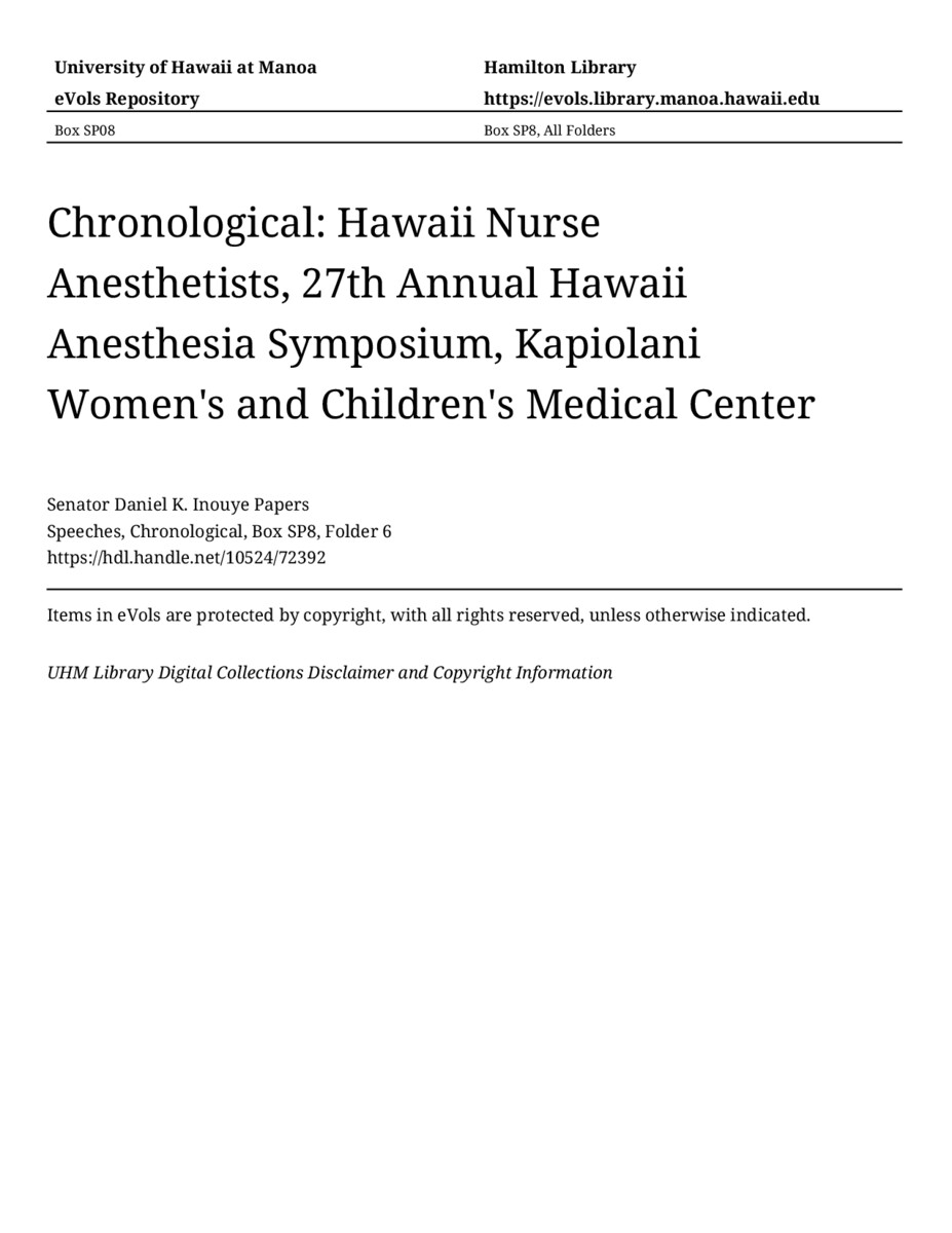 - Hawaii Nurse Anesthetists, 27th Annual Hawaii Anesthesia Symposium, Kapiolani Women's and Children's Medical Center