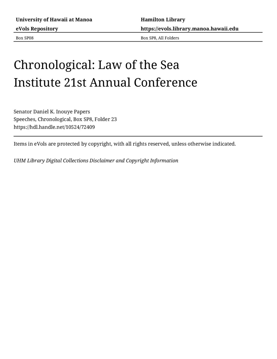 Law of the Sea Institute 21st Annual Conference, March 6, 1987, MANUSCRIPT-HCPC00011, Speeches, Chronological, Box SP8, Folder 23, Senator Daniel K. Inouye Papers, Hawaiʻi Congressional Papers Collection, University of Hawaiʻi at Mānoa Library, Honolulu, HI. https://congressarchives.org/catalog/10524_72409 (accessed March 20, 2026).