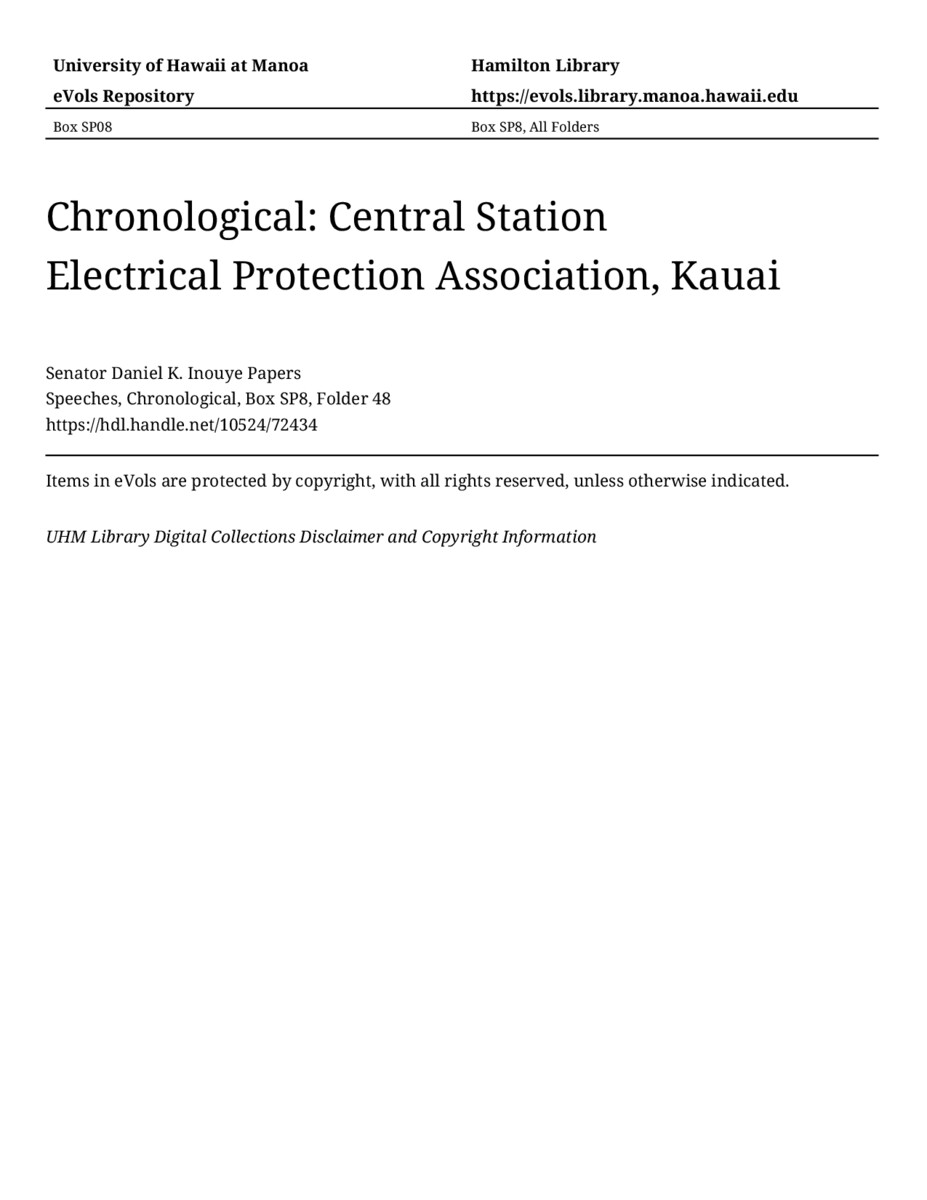 Central Station Electrical Protection Association, Kauai, October 24, 1988, MANUSCRIPT-HCPC00011, Speeches, Chronological, Box SP8, Folder 48, Senator Daniel K. Inouye Papers, Hawaiʻi Congressional Papers Collection, University of Hawaiʻi at Mānoa Library, Honolulu, HI. https://congressarchives.org/catalog/10524_72434 (accessed March 19, 2026).