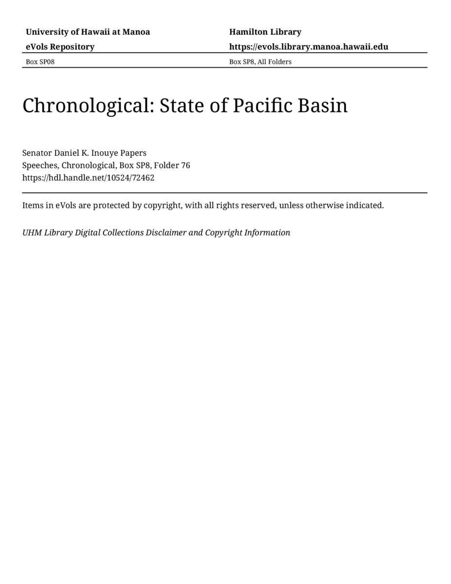 State of Pacific Basin, November 1, 1989, MANUSCRIPT-HCPC00011, Speeches, Chronological, Box SP8, Folder 76, Senator Daniel K. Inouye Papers, Hawaiʻi Congressional Papers Collection, University of Hawaiʻi at Mānoa Library, Honolulu, HI. https://congressarchives.org/catalog/10524_72462 (accessed March 21, 2026).