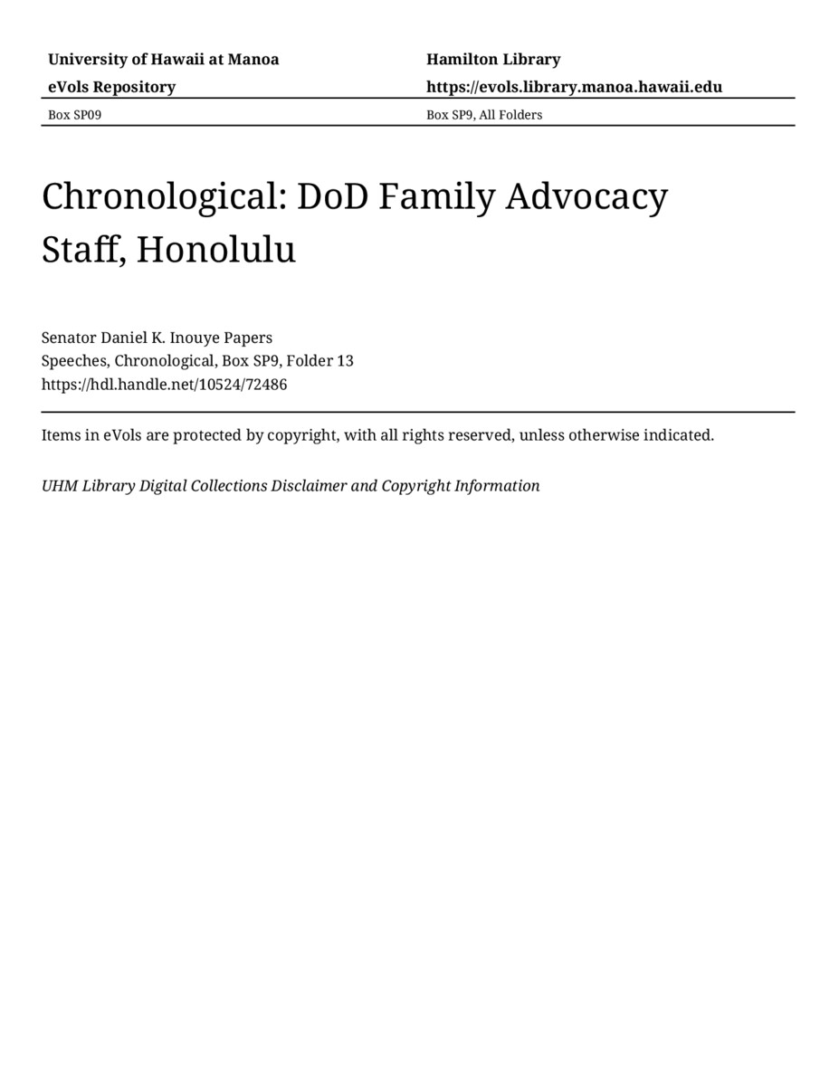 DoD Family Advocacy Staff, Honolulu, August 13, 1990, MANUSCRIPT-HCPC00011, Speeches, Chronological, Box SP9, Folder 13, Senator Daniel K. Inouye Papers, Hawaiʻi Congressional Papers Collection, University of Hawaiʻi at Mānoa Library, Honolulu, HI. https://congressarchives.org/catalog/10524_72486 (accessed March 20, 2026).