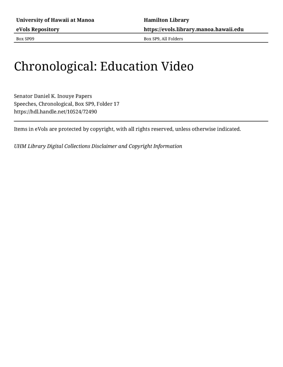 Education Video, October 20, 1990, MANUSCRIPT-HCPC00011, Speeches, Chronological, Box SP9, Folder 17, Senator Daniel K. Inouye Papers, Hawaiʻi Congressional Papers Collection, University of Hawaiʻi at Mānoa Library, Honolulu, HI. https://congressarchives.org/catalog/10524_72490 (accessed March 19, 2026).