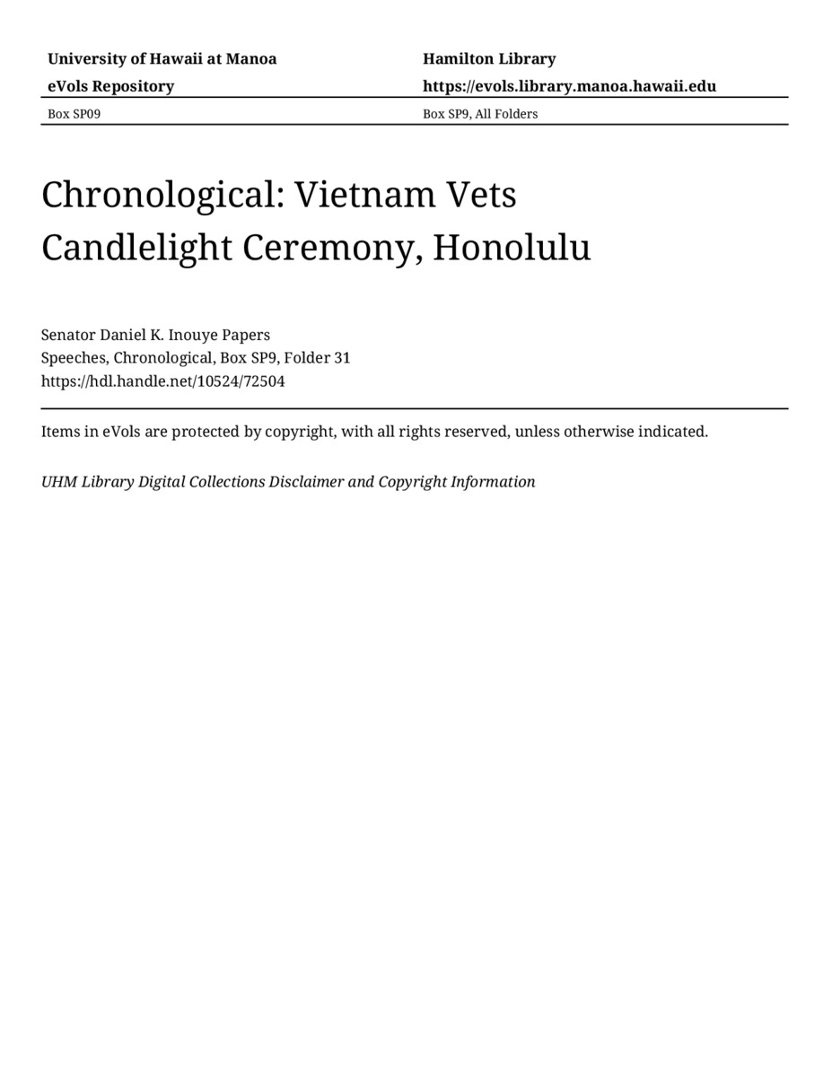 Vietnam Vets Candlelight Ceremony, Honolulu, May 26, 1991, MANUSCRIPT-HCPC00011, Speeches, Chronological, Box SP9, Folder 31, Senator Daniel K. Inouye Papers, Hawaiʻi Congressional Papers Collection, University of Hawaiʻi at Mānoa Library, Honolulu, HI. https://congressarchives.org/catalog/10524_72504 (accessed March 23, 2026).