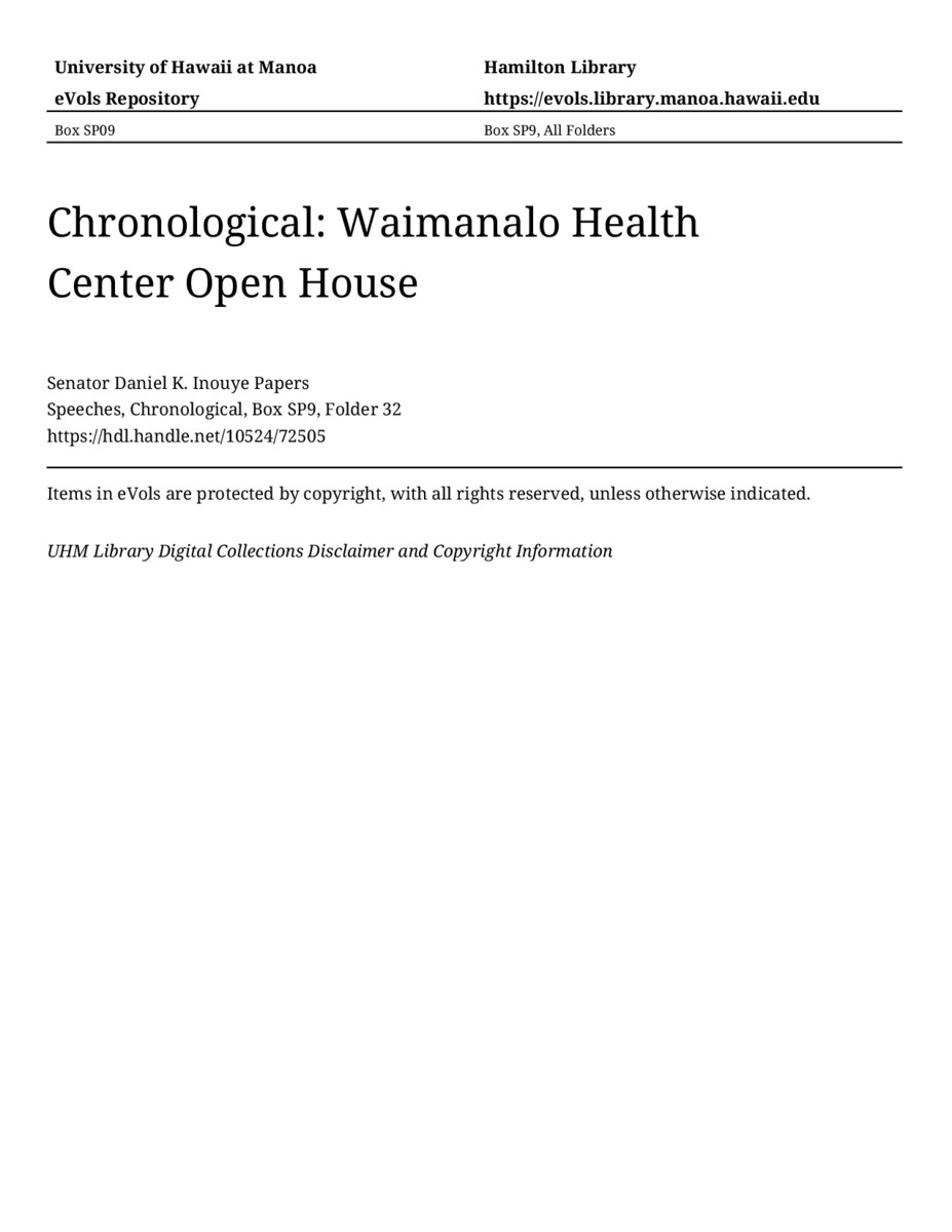 Waimanalo Health Center Open House, May 27, 1991, MANUSCRIPT-HCPC00011, Speeches, Chronological, Box SP9, Folder 32, Senator Daniel K. Inouye Papers, Hawaiʻi Congressional Papers Collection, University of Hawaiʻi at Mānoa Library, Honolulu, HI. https://congressarchives.org/catalog/10524_72505 (accessed March 20, 2026).