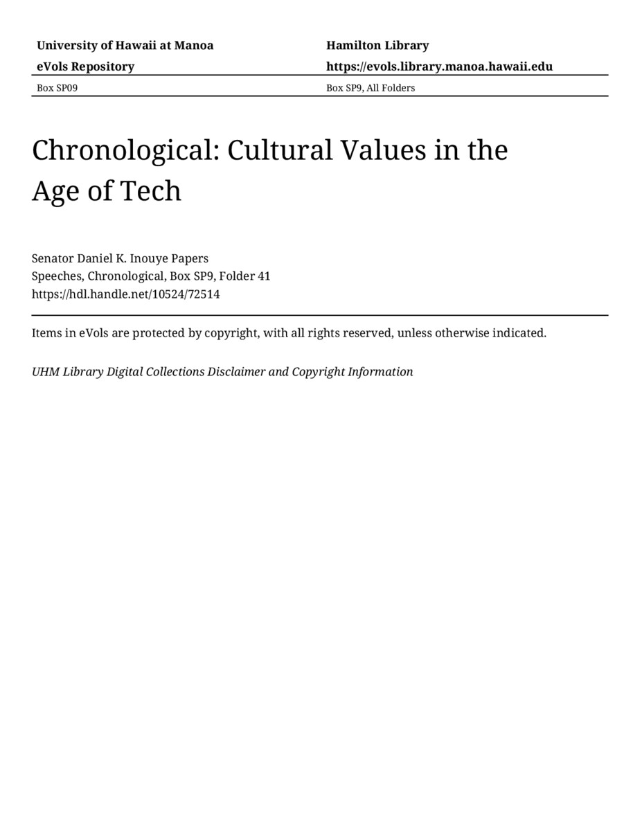 Cultural Values in the Age of Tech, June 25, 1991, MANUSCRIPT-HCPC00011, Speeches, Chronological, Box SP9, Folder 41, Senator Daniel K. Inouye Papers, Hawaiʻi Congressional Papers Collection, University of Hawaiʻi at Mānoa Library, Honolulu, HI. https://congressarchives.org/catalog/10524_72514 (accessed March 22, 2026).