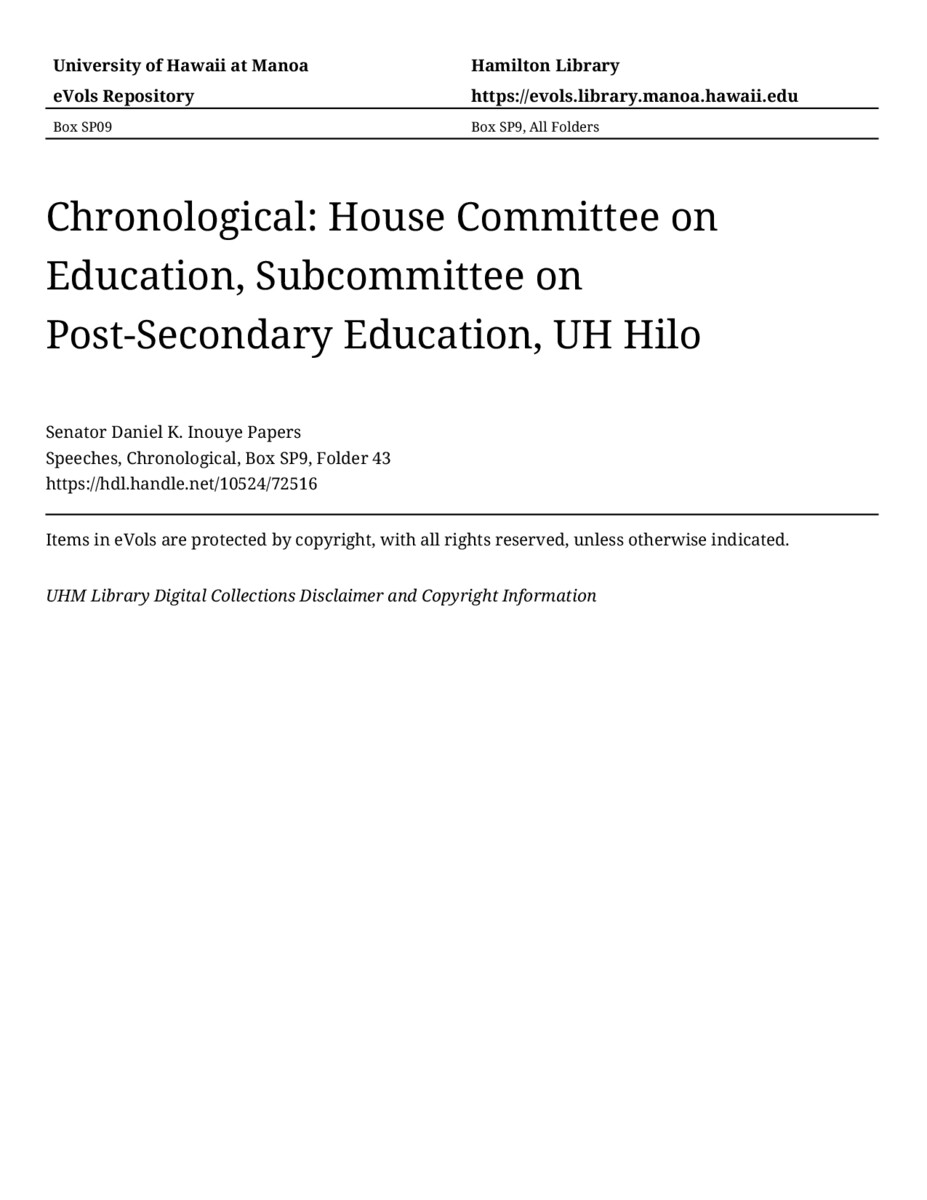 House Committee on Education, Subcommittee on Post-Secondary Education, UH Hilo