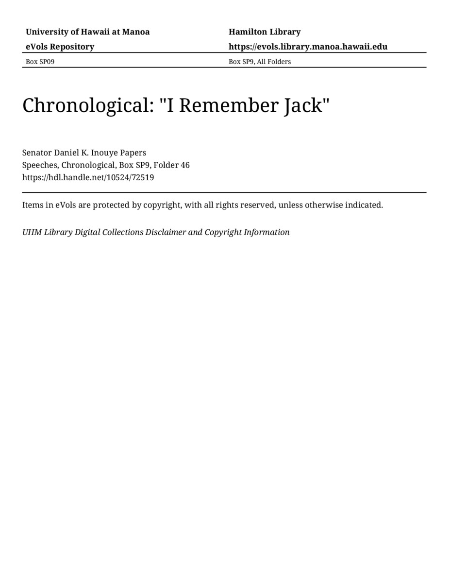 "I Remember Jack", July 19, 1991, MANUSCRIPT-HCPC00011, Speeches, Chronological, Box SP9, Folder 46, Senator Daniel K. Inouye Papers, Hawaiʻi Congressional Papers Collection, University of Hawaiʻi at Mānoa Library, Honolulu, HI. https://congressarchives.org/catalog/10524_72519 (accessed March 21, 2026).