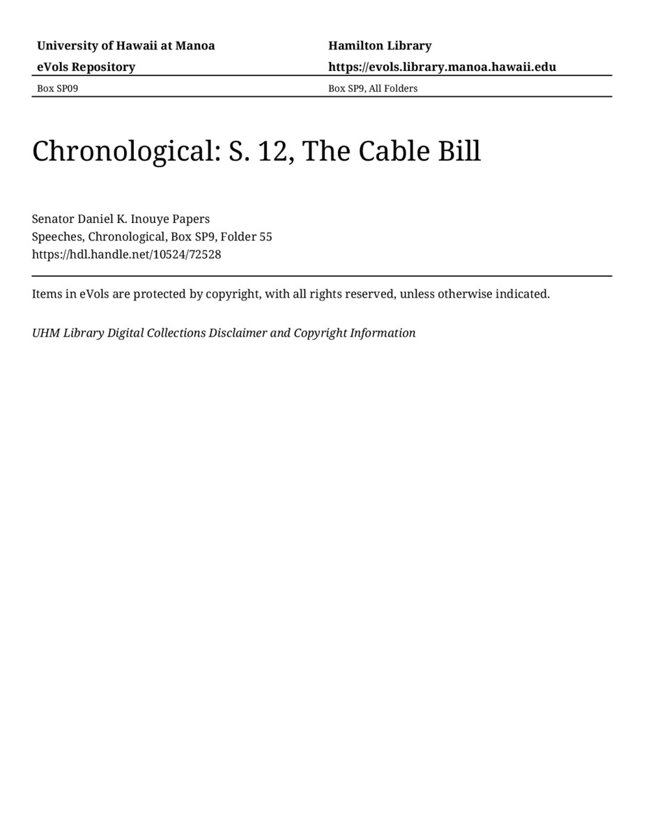 S. 12, The Cable Bill, November 7, 1991, MANUSCRIPT-HCPC00011, Speeches, Chronological, Box SP9, Folder 55, Senator Daniel K. Inouye Papers, Hawaiʻi Congressional Papers Collection, University of Hawaiʻi at Mānoa Library, Honolulu, HI. https://congressarchives.org/catalog/10524_72528 (accessed March 20, 2026).