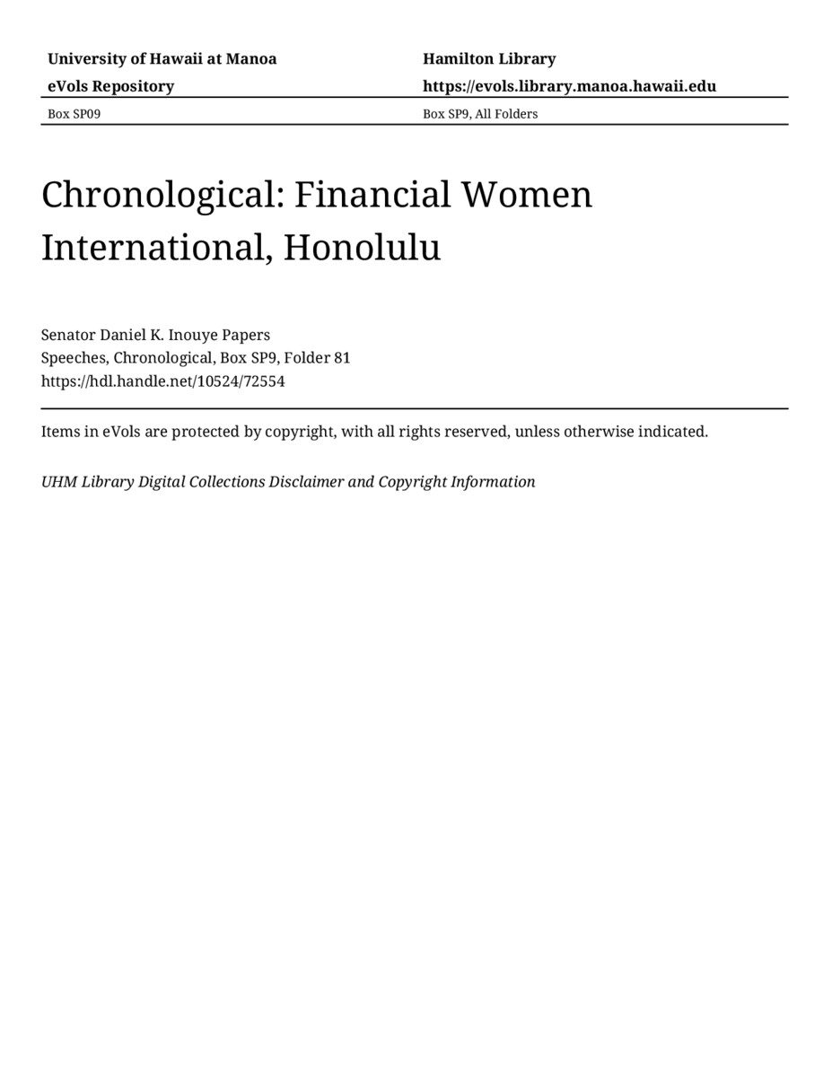 Financial Women International, Honolulu, May 26, 1992, MANUSCRIPT-HCPC00011, Speeches, Chronological, Box SP9, Folder 81, Senator Daniel K. Inouye Papers, Hawaiʻi Congressional Papers Collection, University of Hawaiʻi at Mānoa Library, Honolulu, HI. https://congressarchives.org/catalog/10524_72554 (accessed March 23, 2026).