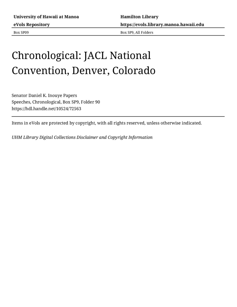 JACL National Convention, Denver, Colorado, August 8, 1992, MANUSCRIPT-HCPC00011, Speeches, Chronological, Box SP9, Folder 90, Senator Daniel K. Inouye Papers, Hawaiʻi Congressional Papers Collection, University of Hawaiʻi at Mānoa Library, Honolulu, HI. https://congressarchives.org/catalog/10524_72563 (accessed March 22, 2026).