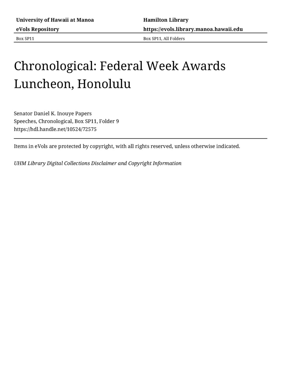 Federal Week Awards Luncheon, Honolulu, May 28, 1997, MANUSCRIPT-HCPC00011, Speeches, Chronological, Box SP11, Folder 9, Senator Daniel K. Inouye Papers, Hawaiʻi Congressional Papers Collection, University of Hawaiʻi at Mānoa Library, Honolulu, HI. https://congressarchives.org/catalog/10524_72575 (accessed March 18, 2026).