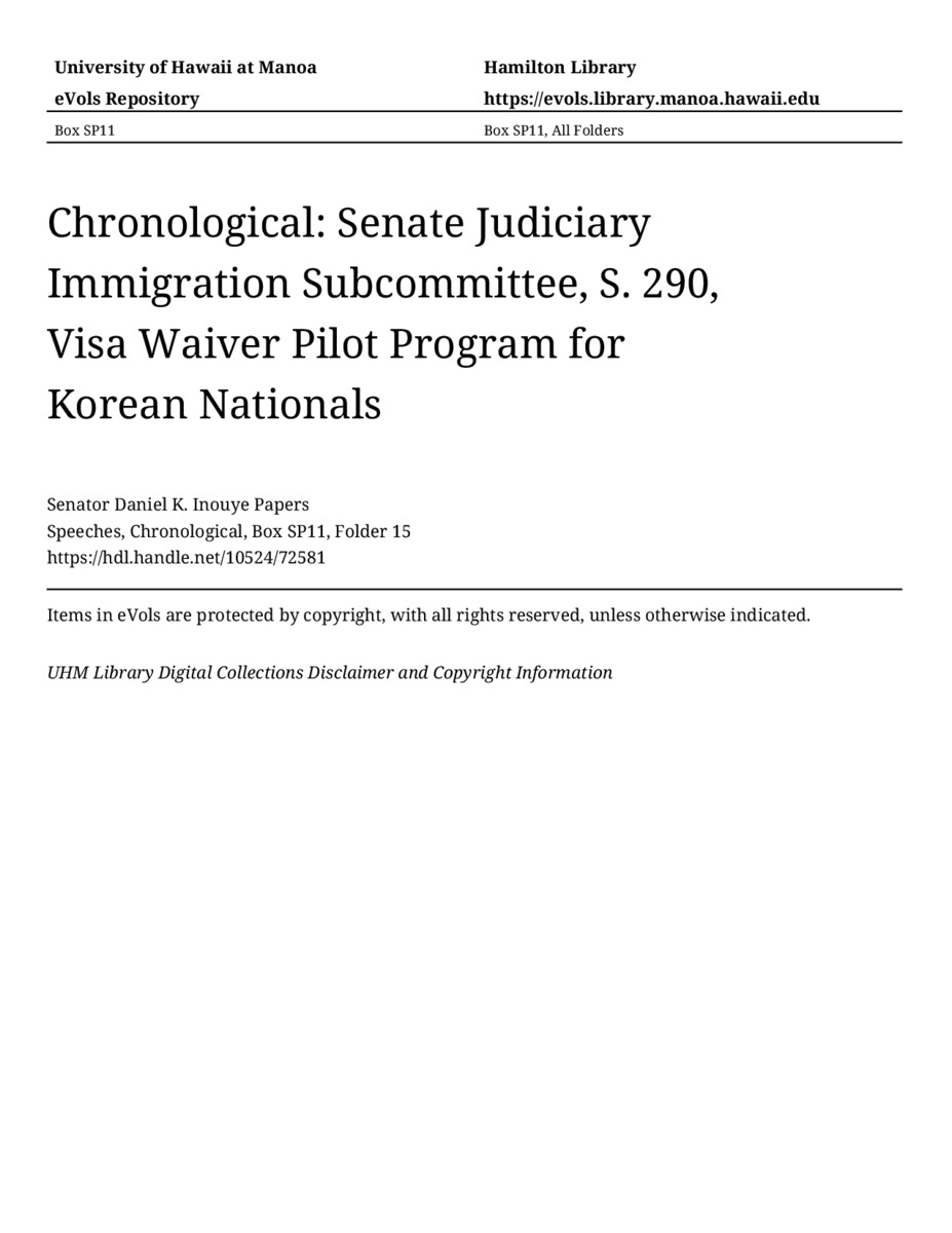 - Senate Judiciary Immigration Subcommittee, S. 290, Visa Waiver Pilot Program for Korean Nationals