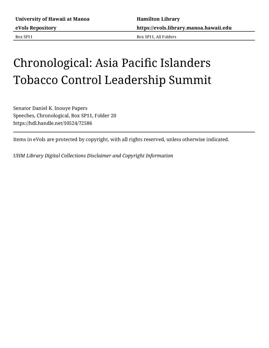 Asia Pacific Islanders Tobacco Control Leadership Summit, August 15, 1997, MANUSCRIPT-HCPC00011, Speeches, Chronological, Box SP11, Folder 20, Senator Daniel K. Inouye Papers, Hawaiʻi Congressional Papers Collection, University of Hawaiʻi at Mānoa Library, Honolulu, HI. https://congressarchives.org/catalog/10524_72586 (accessed March 20, 2026).