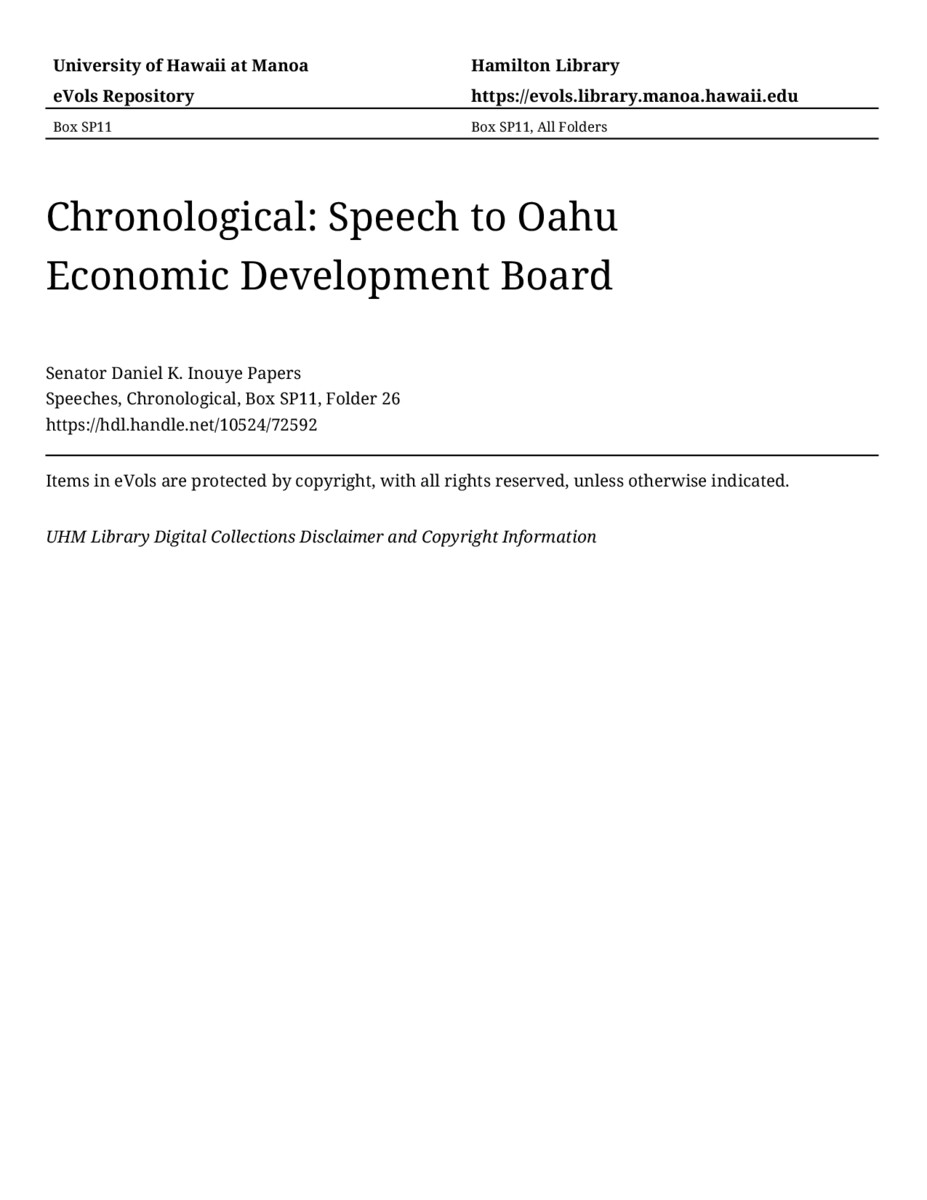 Speech to Oahu Economic Development Board, October 16, 1997, MANUSCRIPT-HCPC00011, Speeches, Chronological, Box SP11, Folder 26, Senator Daniel K. Inouye Papers, Hawaiʻi Congressional Papers Collection, University of Hawaiʻi at Mānoa Library, Honolulu, HI. https://congressarchives.org/catalog/10524_72592 (accessed March 18, 2026).