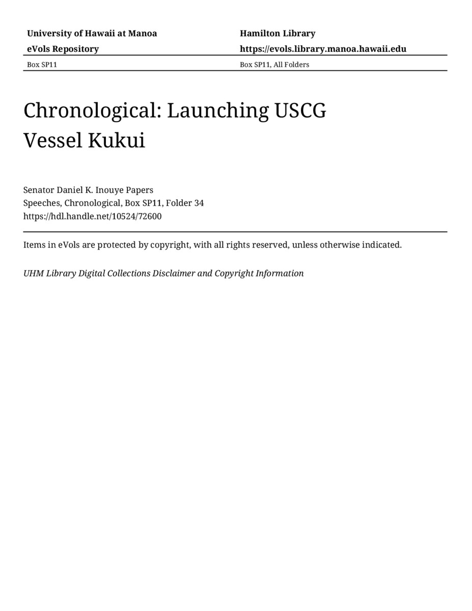Launching USCG Vessel Kukui, January 9, 1998, MANUSCRIPT-HCPC00011, Speeches, Chronological, Box SP11, Folder 34, Senator Daniel K. Inouye Papers, Hawaiʻi Congressional Papers Collection, University of Hawaiʻi at Mānoa Library, Honolulu, HI. https://congressarchives.org/catalog/10524_72600 (accessed March 20, 2026).