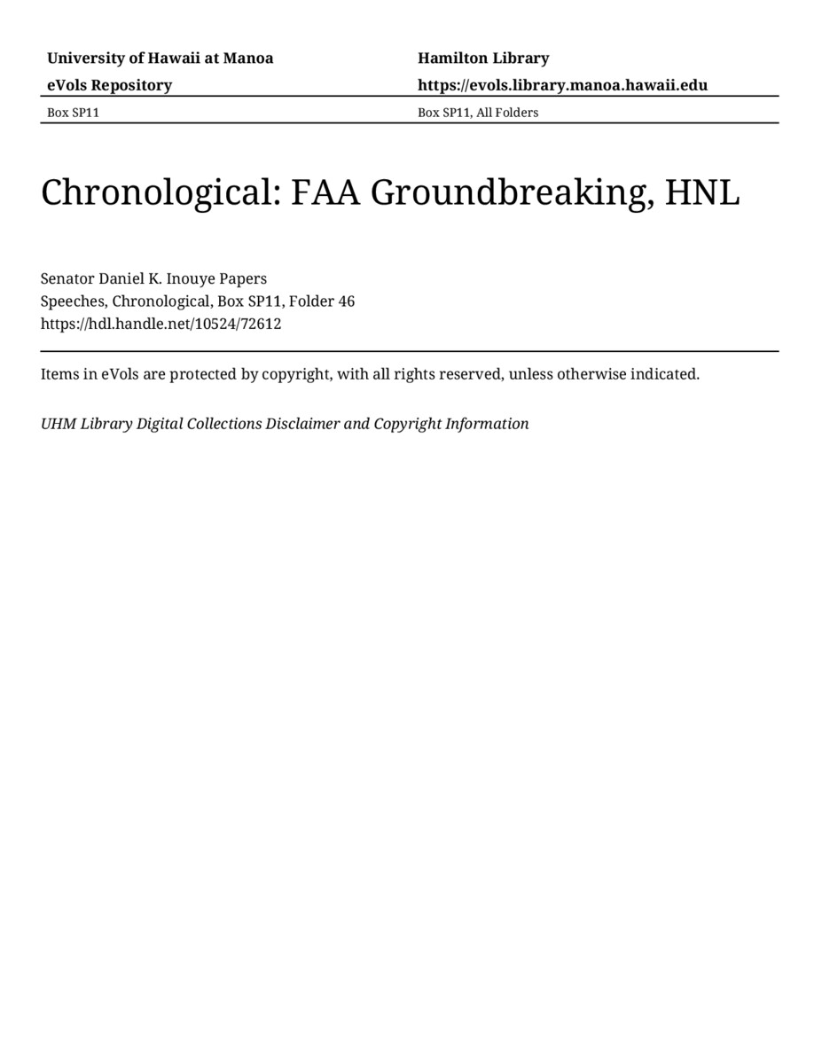 FAA Groundbreaking, HNL, March 14, 1998, MANUSCRIPT-HCPC00011, Speeches, Chronological, Box SP11, Folder 46, Senator Daniel K. Inouye Papers, Hawaiʻi Congressional Papers Collection, University of Hawaiʻi at Mānoa Library, Honolulu, HI. https://congressarchives.org/catalog/10524_72612 (accessed March 20, 2026).
