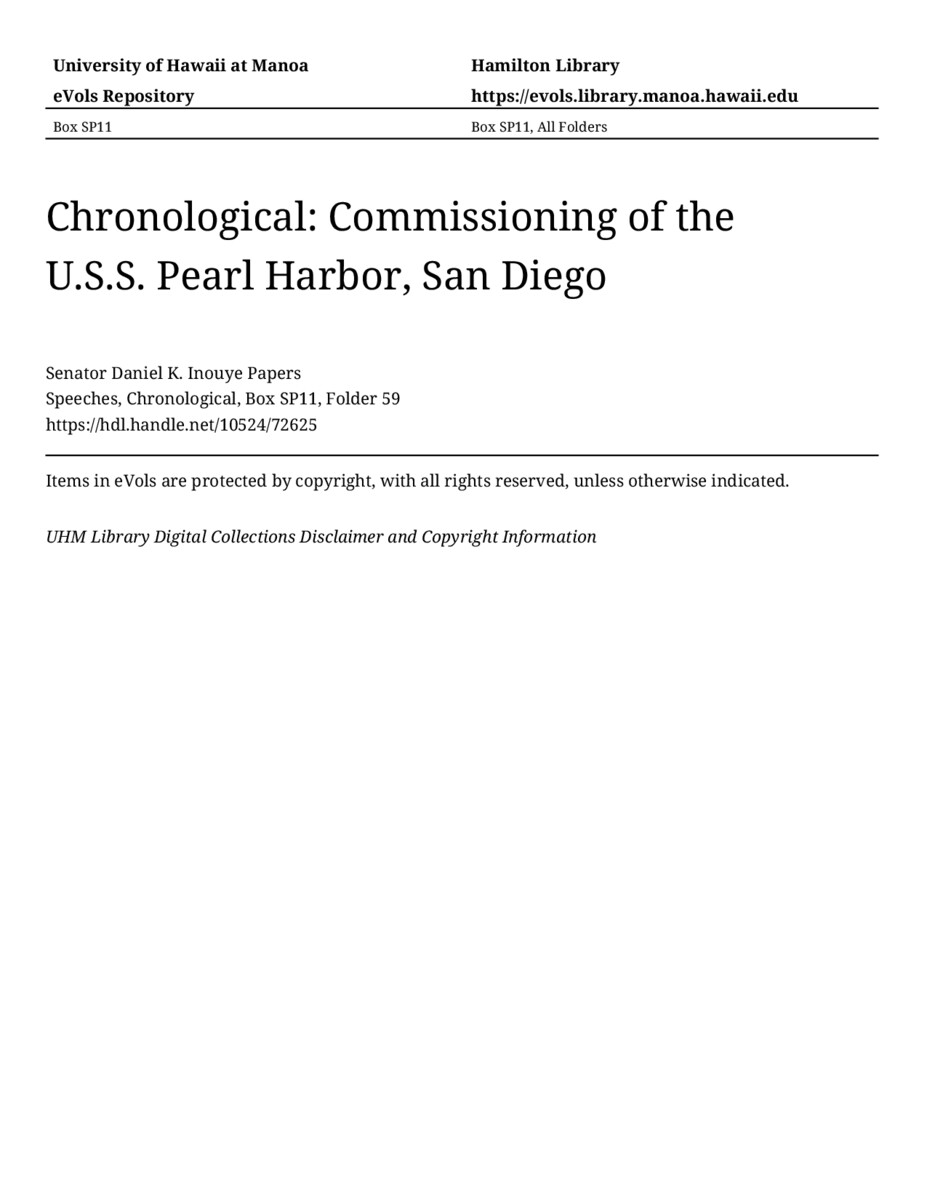 Commissioning of the U.S.S. Pearl Harbor, San Diego, May 30, 1998, MANUSCRIPT-HCPC00011, Speeches, Chronological, Box SP11, Folder 59, Senator Daniel K. Inouye Papers, Hawaiʻi Congressional Papers Collection, University of Hawaiʻi at Mānoa Library, Honolulu, HI. https://congressarchives.org/catalog/10524_72625 (accessed March 21, 2026).