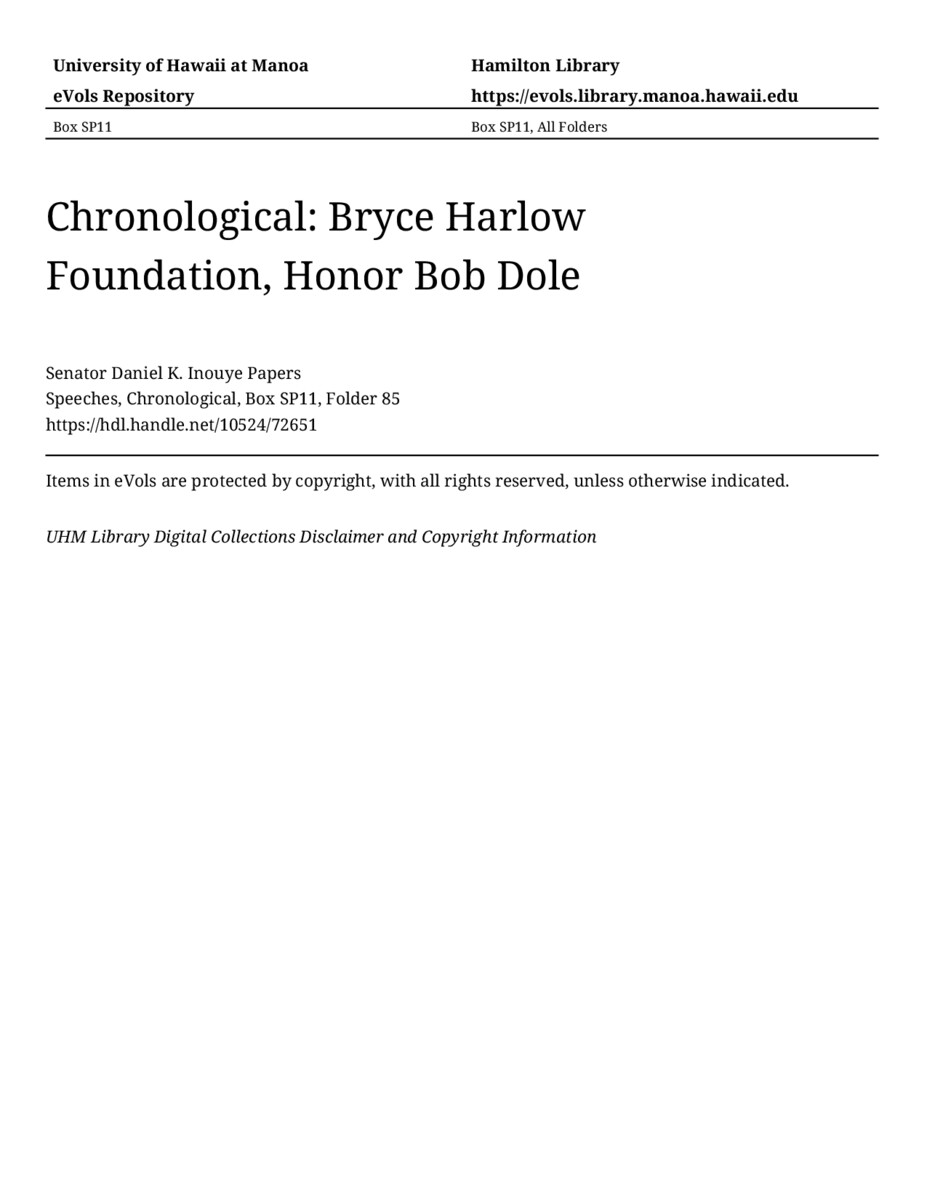 Bryce Harlow Foundation, Honor Bob Dole, April 20, 1999, MANUSCRIPT-HCPC00011, Speeches, Chronological, Box SP11, Folder 85, Senator Daniel K. Inouye Papers, Hawaiʻi Congressional Papers Collection, University of Hawaiʻi at Mānoa Library, Honolulu, HI. https://congressarchives.org/catalog/10524_72651 (accessed March 20, 2026).