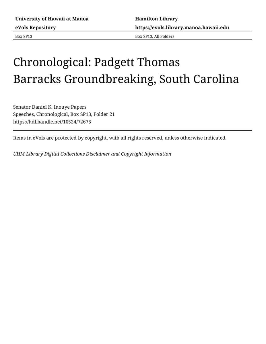 Padgett Thomas Barracks Groundbreaking, South Carolina, April 27, 2002, MANUSCRIPT-HCPC00011, Speeches, Chronological, Box SP13, Folder 21, Senator Daniel K. Inouye Papers, Hawaiʻi Congressional Papers Collection, University of Hawaiʻi at Mānoa Library, Honolulu, HI. https://congressarchives.org/catalog/10524_72675 (accessed March 21, 2026).