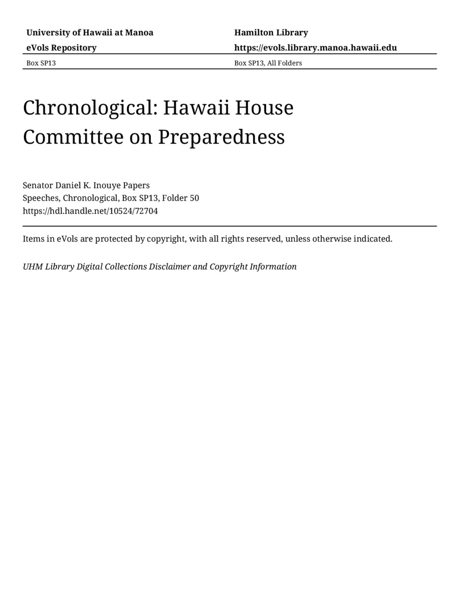 Hawaii House Committee on Preparedness, April 21, 2003, MANUSCRIPT-HCPC00011, Speeches, Chronological, Box SP13, Folder 50, Senator Daniel K. Inouye Papers, Hawaiʻi Congressional Papers Collection, University of Hawaiʻi at Mānoa Library, Honolulu, HI. https://congressarchives.org/catalog/10524_72704 (accessed March 18, 2026).