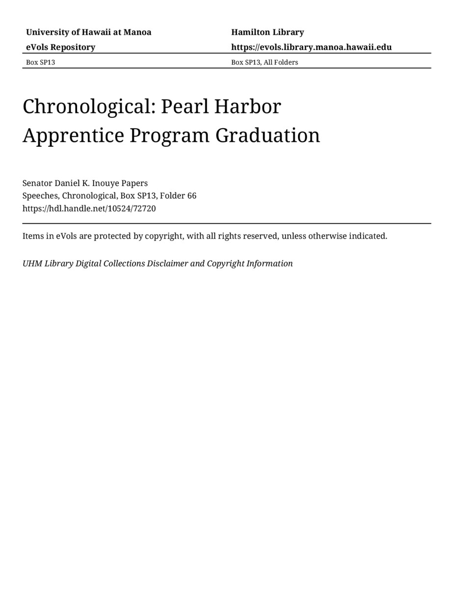 Pearl Harbor Apprentice Program Graduation, August 15, 2003, MANUSCRIPT-HCPC00011, Speeches, Chronological, Box SP13, Folder 66, Senator Daniel K. Inouye Papers, Hawaiʻi Congressional Papers Collection, University of Hawaiʻi at Mānoa Library, Honolulu, HI. https://congressarchives.org/catalog/10524_72720 (accessed March 21, 2026).